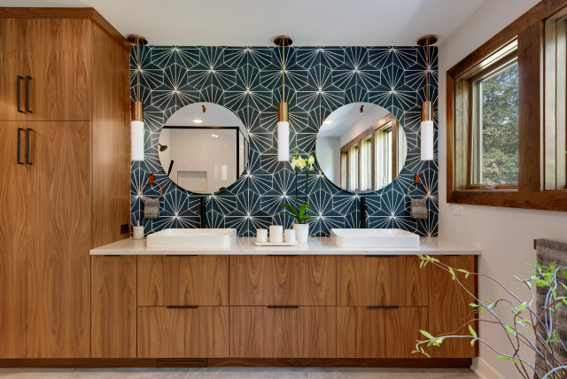 Ohana Home & Design took this midcentury modern bathroom to the next level by using patterned geometric hexagonal tile in a dark marine blue from the vanity countertop to the ceiling. The white linear pattern on the tiles creates a celestial feeling and provides stark contrast to the walnut cabinets.